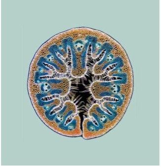 De plakjes plant zijn even raadselachtig als mooi. Rob van Es: ‘Dit zevenluik gaat over per- spectief, een andere manier van kijken. Iedereen weet hoe helmgras en duindoorn er van buiten uit zien, maar bijna niemand heeft die planten ooit van binnen gezien. Onder de mi- croscoop ontdek je een landschap vol cellen, buisjes en filters die water, suikers en zout opslaan en begeleiden.
